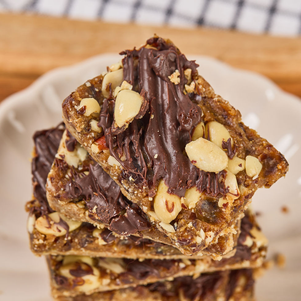 Almond butter, oat flour, dates, peanuts, vegan chocolate, peanut butter, coconutoil.